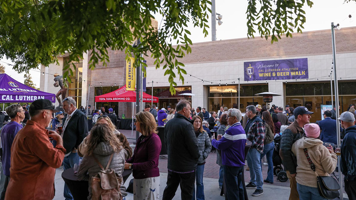 Attendees of the inaugural Wine & Beer Walk fill the plaza between William Rolland Stadium and Gilbert Sports and Fitness Center last year. The 2026 walk is set for Friday, April 24. Tickets are $75 for Cal Lutheran faculty and staff and $99 for the general public. |