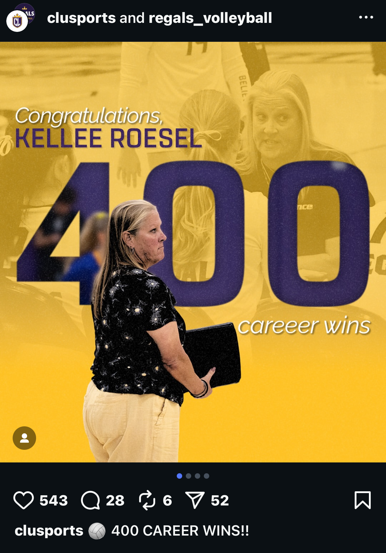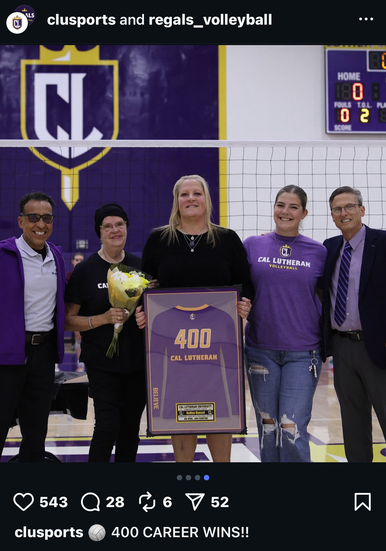 The official Cal Lutheran Sports and Regal volleyball accounts celebrate an incredible milestone for longtime women’s volleyball head coach Kellee Roesel: 400 career wins. Roesel, now in her 20th season, reached the mark in a 3-0 victory over Redlands on Oct. 4. She is the winningest volleyball coach in university history. “I’m living this year with a grateful heart for (assistant coach) Kevin Judd, for sure, who’s crazy enough to stick with me,” Roesel said. |