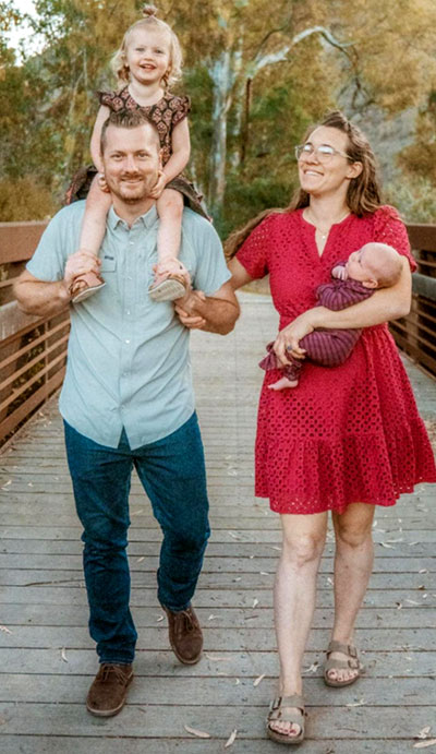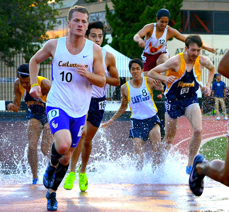 Nowadays, former Cal Lutheran distance runner Shawn Jackson, shown at right competing in the steeplechase in 2013, is taking on the greatest challenge of all, being a dad. He's pictured at left with wife, Liz; 2-year-old Maggie and newborn Rosalie. Jackson teaches math and coaches cross country and track at nearby Nordhoff High School in Ojai. “The small-town community keeps me here and helps me feel the impact of my teaching and coaching,” he said. Photos: Courtesy of Shawn Jackson