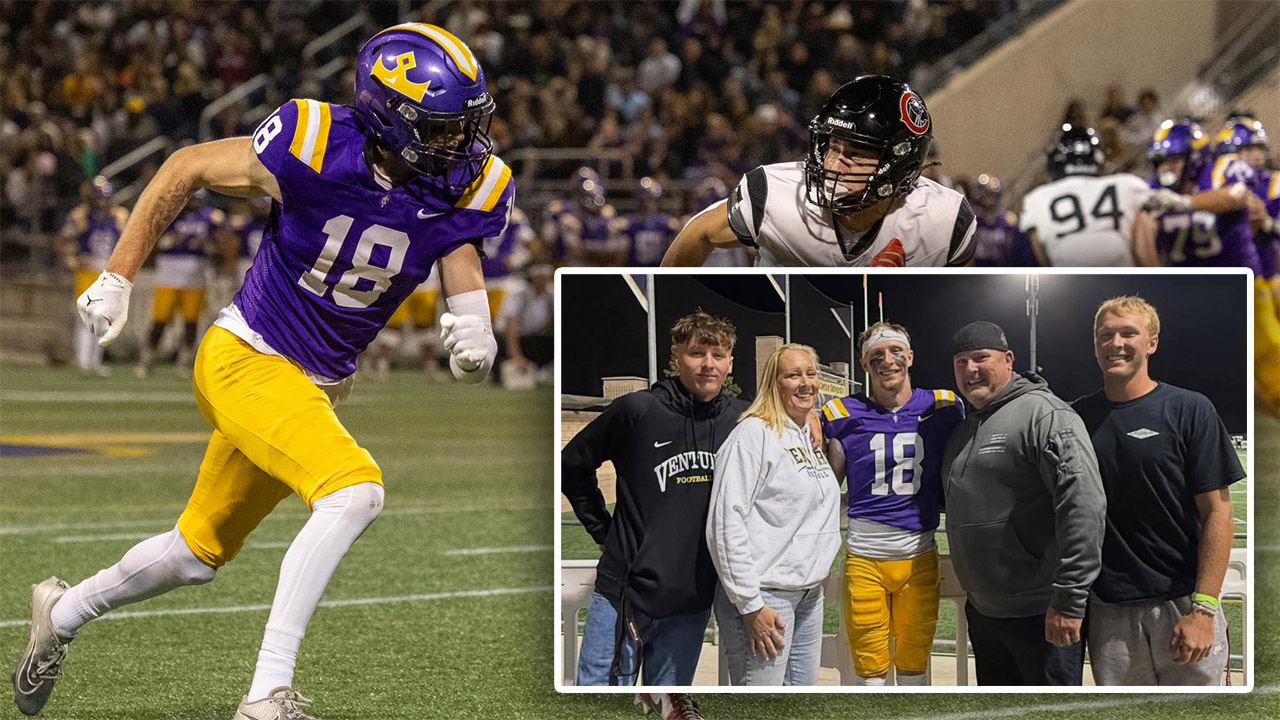 Tyler Woodworth, the Kingsmen’s leading receiver, rockets off the line against Chapman on Oct. 17. The junior standout is following in the footsteps of his father, Brian, who earned All-American Honorable Mention honors in the early 2000s. Tyler, pictured above with his brothers Josh and Trevor and his parents, Robyn and Brian, is one of several current student-athletes who proudly carry on a family legacy every time they compete in purple and gold. Action photo: Kendal Lanz