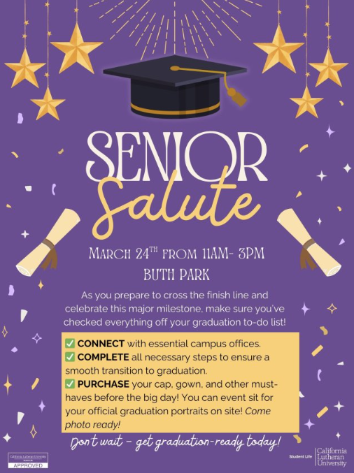 Tuesday, March 24, 2026 11:00 am - 3:00 pm Buth Park Senior Salute is a campus-wide event designed to support graduating seniors as they prepare for commencement.