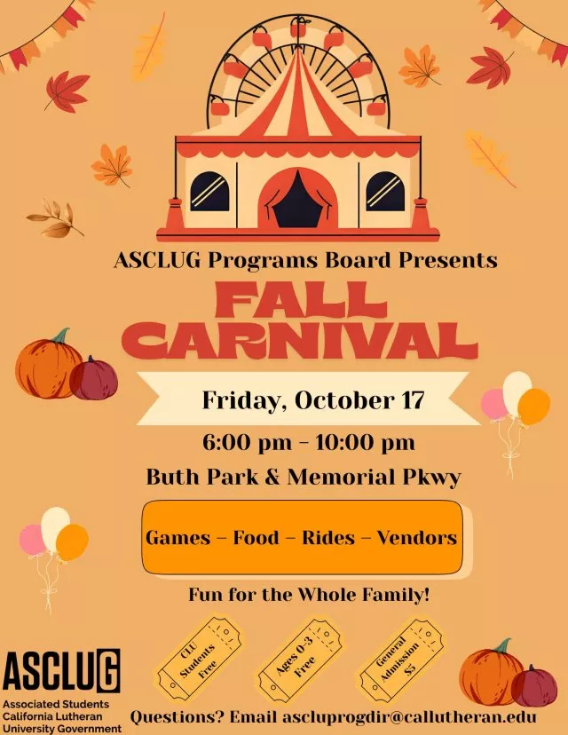 Friday, October 17, 2025 6:00 pm - 10:00 pm Memorial Parkway & Buth Park Join the ASCLUG Programs Board for their annual Fall Carnival, a beloved Homecoming Weekend tradition! Celebrate the season with an evening filled with food, games, rides, and fun for students, families, alumni, and community members alike.