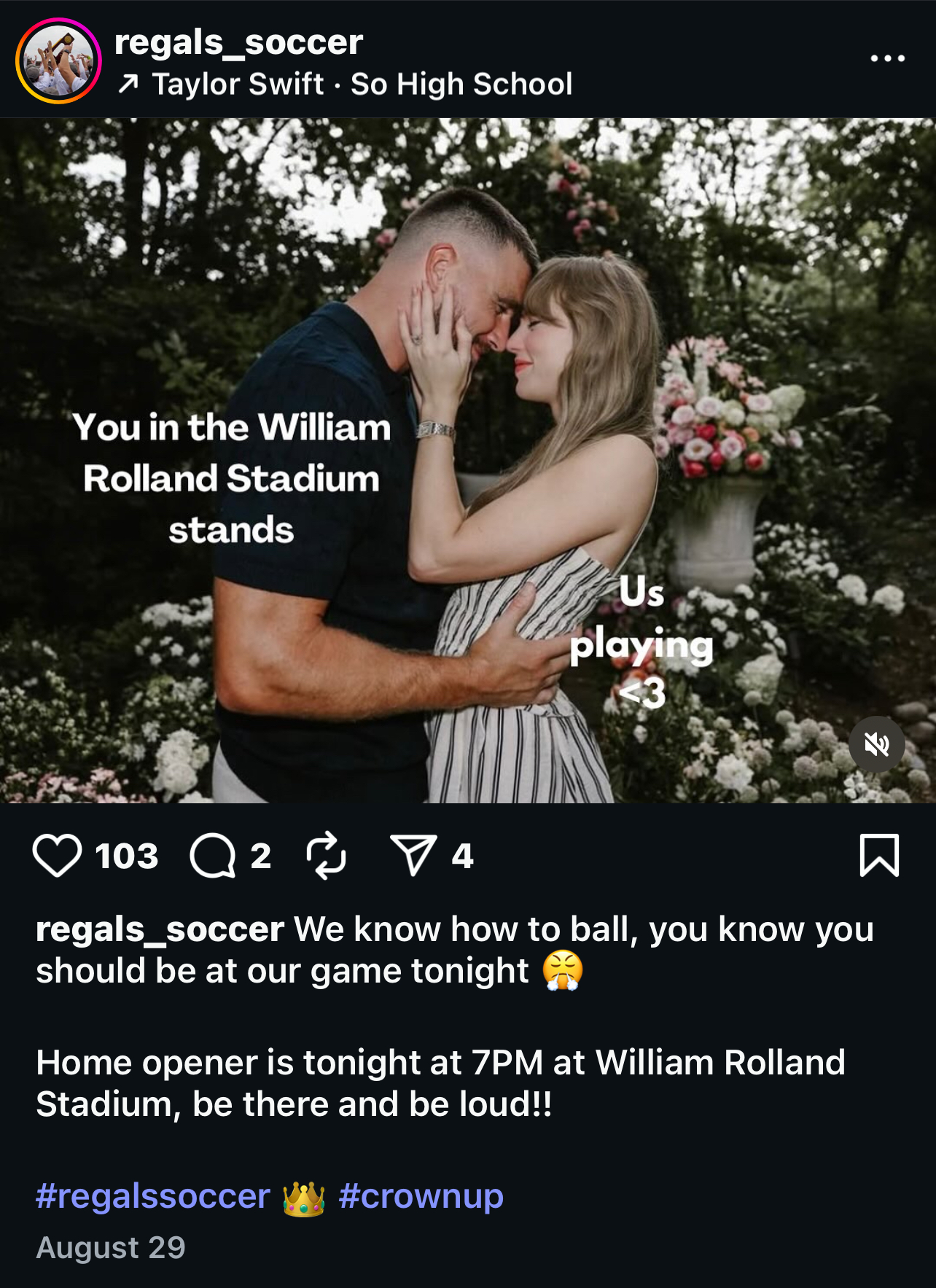 Regals soccer is serious about filling the stands. Their social media team capitalized on the biggest celebrity news of the year — the engagement of Taylor Swift and Travis Kelce — to promote their home opener against Fredonia State on Aug. 30. Subsequently, a solid defensive effort (1-0) left their opponent with a “Blank Space” in the score column.   |