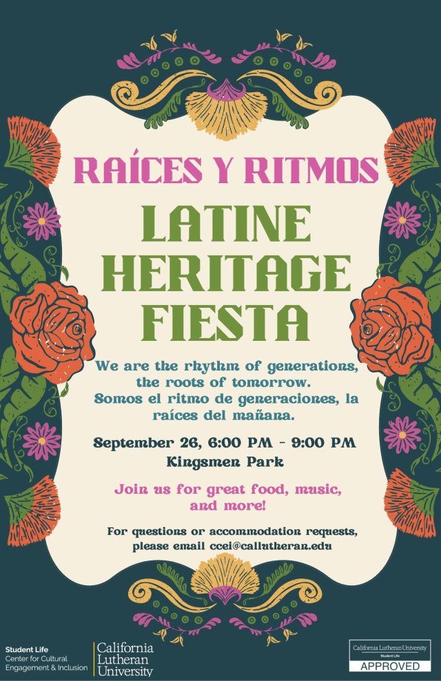 5th annual Latine Heritage Fiesta, in honor and celebration of Latine Heritage Month. All students are welcome to come together in community, enjoy the festivities, and celebrate the contributions and heritage of the Latine community.